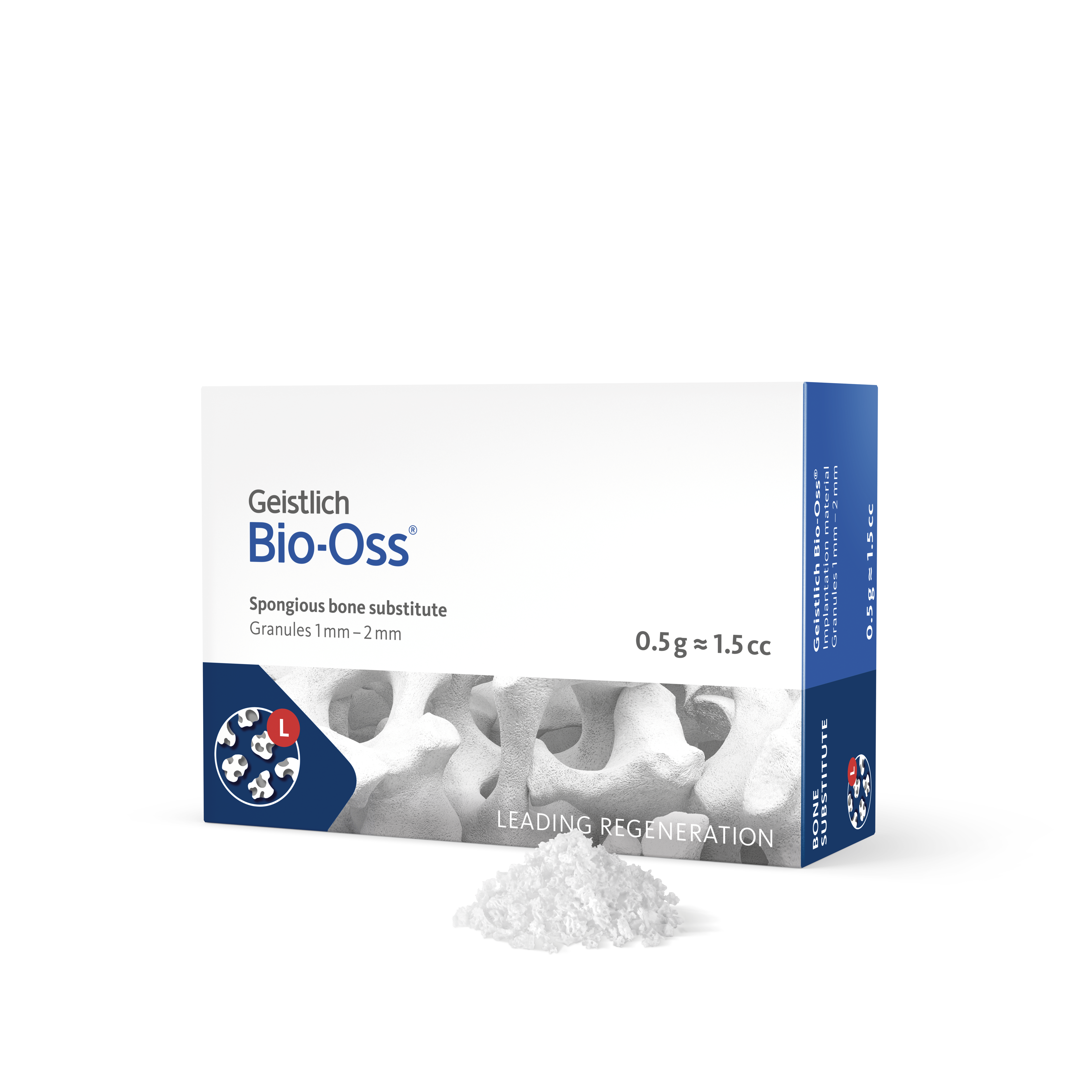 Geistlich Bio-Oss® é o substituo ósseo líder usado em odontologia no mundo inteiro. As excelentes propriedades osteocondutivas de Geistlich Bio-Oss®conduzem a uma regeneração óssea previsível e eficiente. As partículas de Geistlich Bio-Oss® se tornam parte integral da estrutura óssea recém-formada e conservam seu volume a longo prazo. A aplicação subsequente da membrana Geistlich Bio-Gide® permite uma regeneração descomplicada na área enxertada.